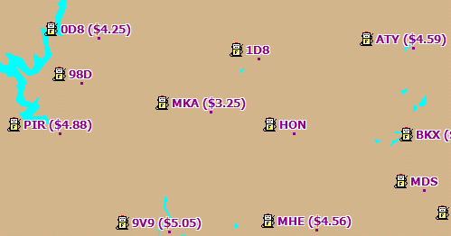 Voyager selected SZT, DIK and ISW as fuel stops. Checking these, it seemed like the fuel prices were a little steep ($4.58 at DIK, for example) and we probably could do with one fewer stop. So, cursing the programmers a little, I clicked the large Fuel Prices button on the main toolbar to change to a theme that basically just shows fuel prices, a very handy feature. Then I used the Hand tool to move the Chart around, zoom in, zoom out, etc. until I thought I had found better choices by stopping at HLN ($3.85) and MKA ($3.25) instead. This wasn't hard, but it did involve moving the Chart a lot, expanding and contracting the NavLog to ensure that we didn't run low on fuel during any leg, and I had to click on each airport to ensure IFR approaches and the required runway length. This process took about 20 minutes, but when it was done I thought I made some good choices and was proud that I was able to beat the computer. And 20 minutes work for nine hours of flying didn't seem too bad.